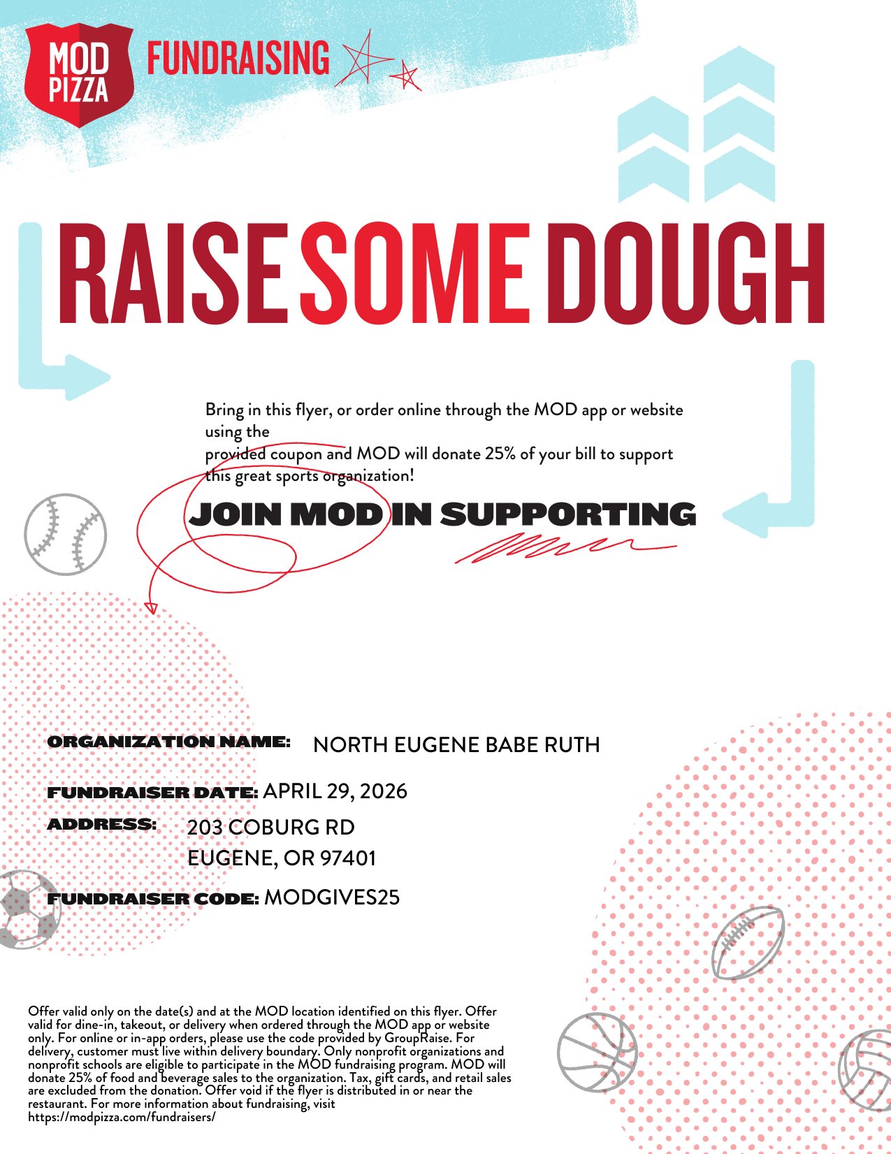 North Eugene Babe Ruth Baseball UPCOMING FUNDRAISER MOD PIZZA! Every pizza you enjoy helps us continue doing the work we love. Location: MOD Pizza - 203 Coburg Rd Date: April 29th Time: All Day! (10:30AM-10PM) Bring your friends, family, and appetite—because giving back never tasted so good! Don’t forget to mention our program at checkout (or use our code MODGIVE25 for online ordering)! Thank you for your support—we can’t wait to see you there! T-ball registration is NOW OPEN Use the button above to sign up your kid (ages 5 through 7) for a fun season of t-ball! 2026 COACHES APPLICATION NEBR coaches applications for the upcoming season are now being accepted! APPLY TO COACH T-ball registration is now OPEN! Go North! Keep in touch in the off-season, follow us on Facebook! Check out our team's 2026 game schedules below: Latest News & Events 2026 Save the Dates! Parent Info FAQs NEBR T-Ball FAQs Be A NEBR Champion: Volunteer! MEET THE BOARD FIELD LOCATIONS EMAIL US